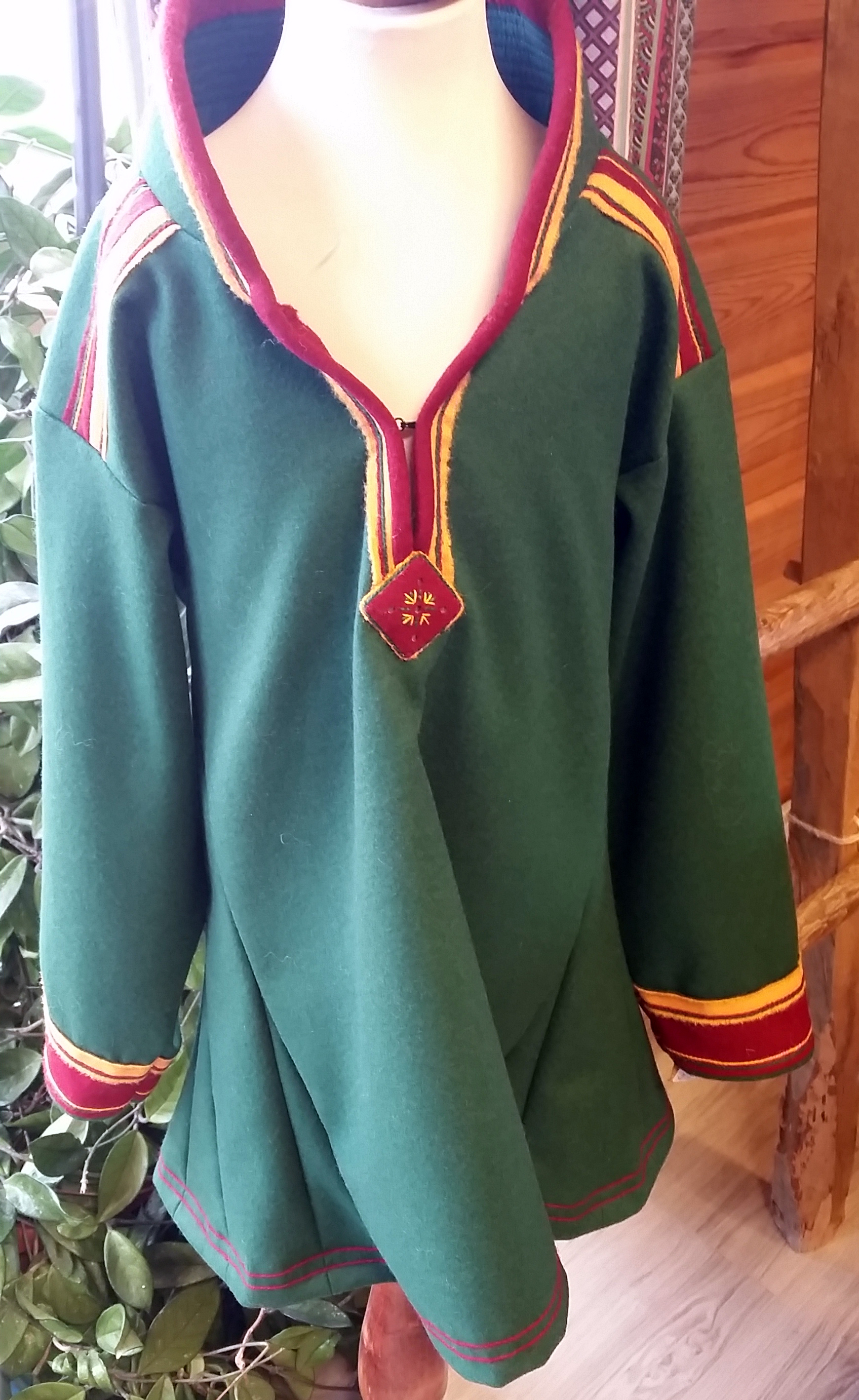 SamitunicOne of the classes offered to the participants of the 2015 textile study tour at the Manndalen Husflidslag was the use of mica as a decorative element in the Sami folk costume. The materials used were felt, mica, wool yarn and fabric, and embroidery floss. First we used a leather punch to cut holes in a piece of fulled wool fabric backed with an interlining. I later cut mine to form a cloverleaf shape. The mica was taped to the back over the holes and then we sewed that piece onto a piece of hard felt. I then embroidered the piece, though others did the embroidery earlier. I sewed a piece of wool yarn around the clover leaf shape then covered it with the shinier embroidery floss.
